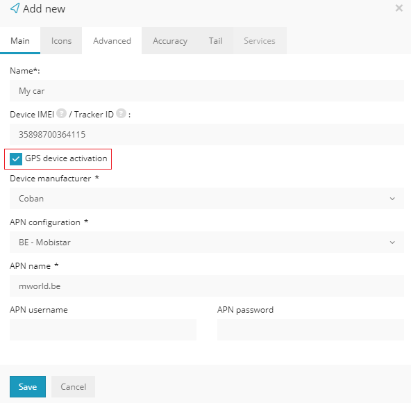 A new menu will appear asking to fill out the name of the object and IMEI. The IMEI of the device can be found printed in a sticker on the device. Once the information is filled out, select the "GPS device activation" option and select the manufacturer of the device and the APN of the SIM data carrier.