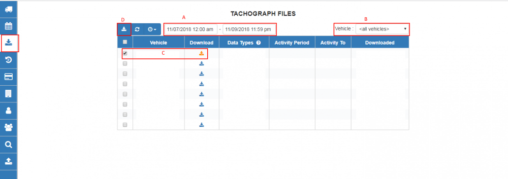 There will be shown all downloaded Tachograph files. Tachograph files can be filtered by date A and vehicle B.